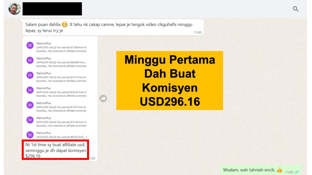 Pada awalnya, dia agak skeptikal… tapi lepas dia cuba promosi kat Facebook Wall dia je, dia sendiri tak sangka… dalam seminggu dah berjaya buat komisyen USD296.16, kalau tukar ke duit Malaysia, dengan kadar USD1: RM4.50, dia dah buat nak dekat RM1,500!